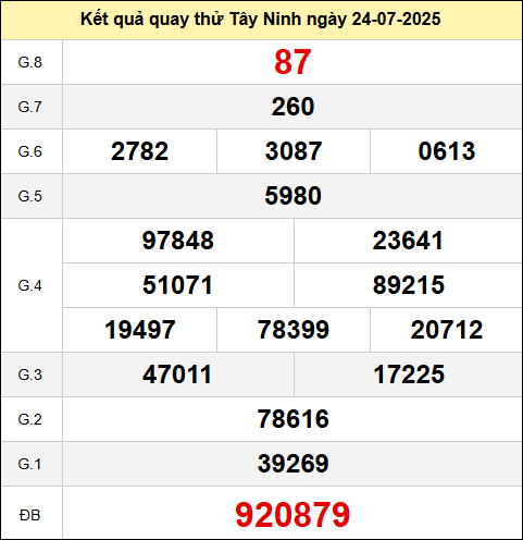 Thống kê giải đặc biệt XSTN ngày 24/7/2025