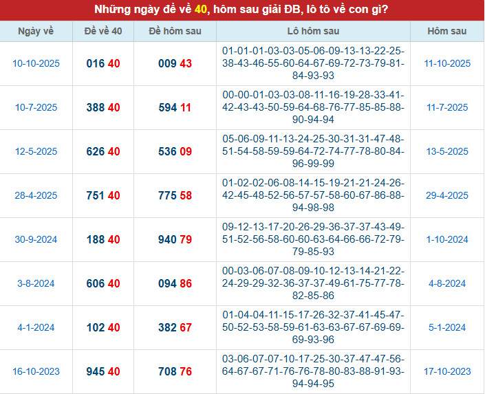 Tổng thể, khi đề về 40, dữ liệu cho thấy xu hướng kết quả hình thành từ các cụm số trung cao và các cặp đảo, trong đó các số xuất hiện dày trong dàn lô, đặc biệt vùng 6x – 9x, đóng vai trò quyết định trong việc tạo ra kết quả ngày hôm sau.